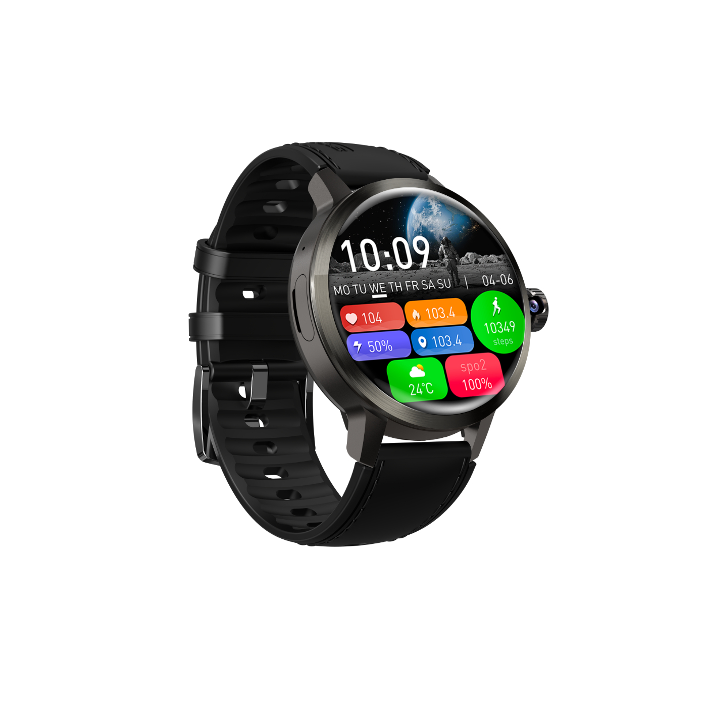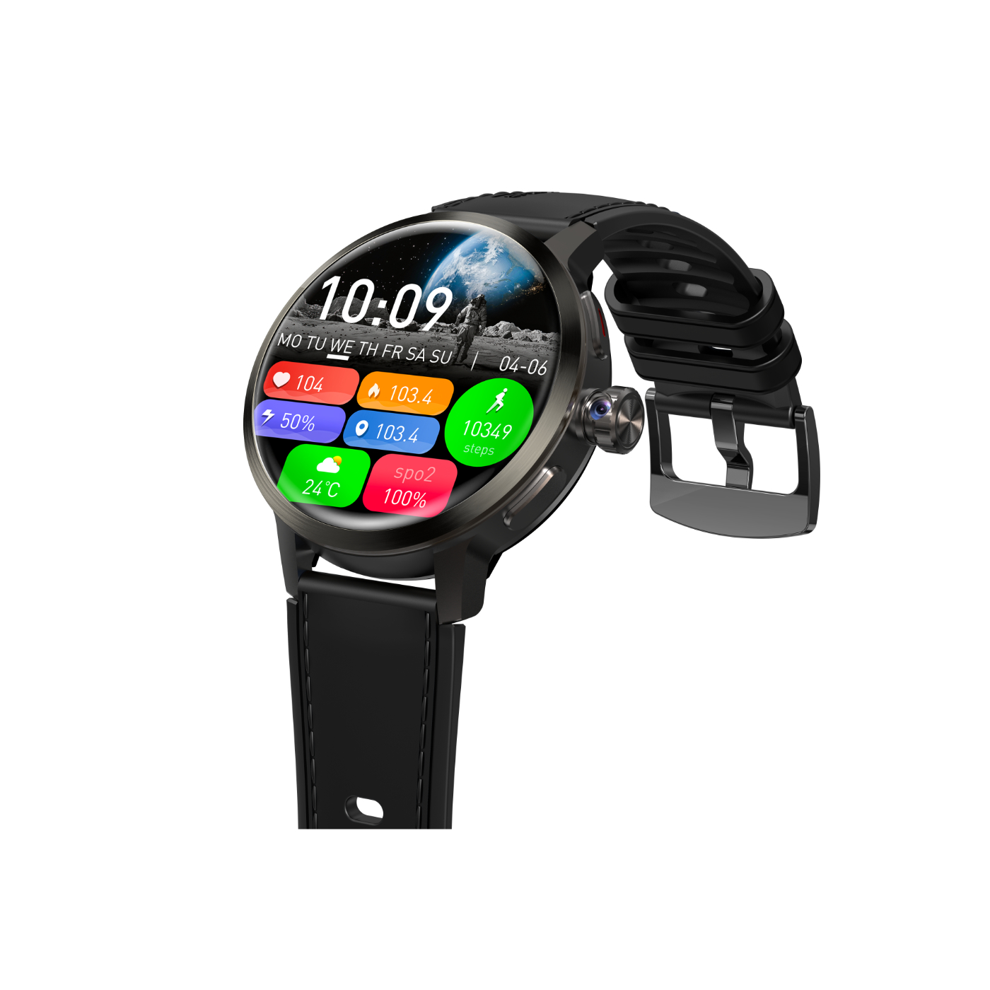 reproduce y controla tu música, y monitorea ritmo cardíaco, presión arterial, oxígeno en sangre, consumo de calorías, sueño, pasos, tiempo de ejercicio y sedentarismo; ofrece múltiples modos deportivos, cámara giratoria de 2 MP (180°), GPS integrado, brújula, barómetro, temporizador, cronómetro, alarma, control de cámara remota, función localizar móvil, inteligencia artificial, consulta del clima y resistencia al agua IP68; su batería de polímero de 1520 mAh brinda hasta 120 horas de duración, y su memoria interna de 2GB RAM + 16GB ROM asegura un rendimiento ágil.